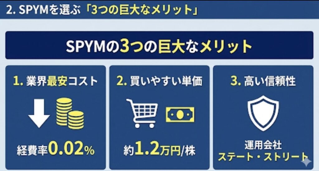 SPYMは、機関投資家向けの「SPY」や、資金力のある人向けの「VOO」に対し、「これから資産を築いていく個人投資家」のために設計されたようなETFです。