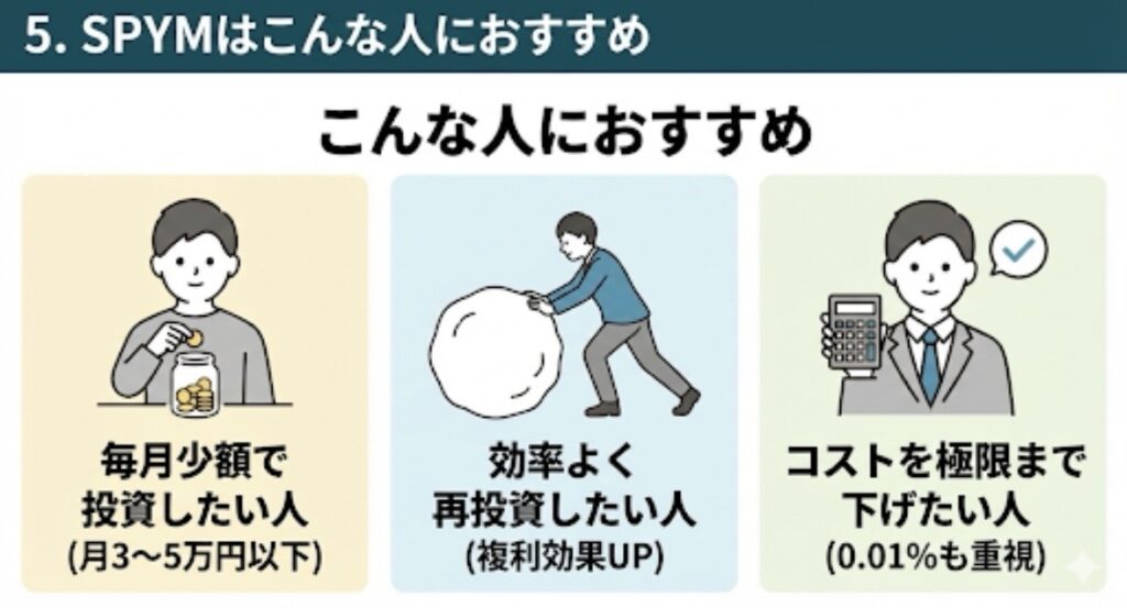 受け取った配当金が少額でも、単価の安いSPYMならすぐに新しい株を買い増せます(複利効果の最大化)。