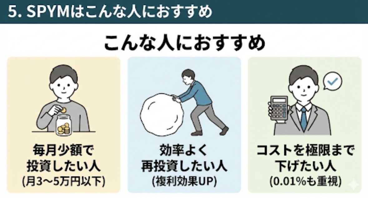 以上の特徴から、SPYMは以下のような投資家に最適です。
