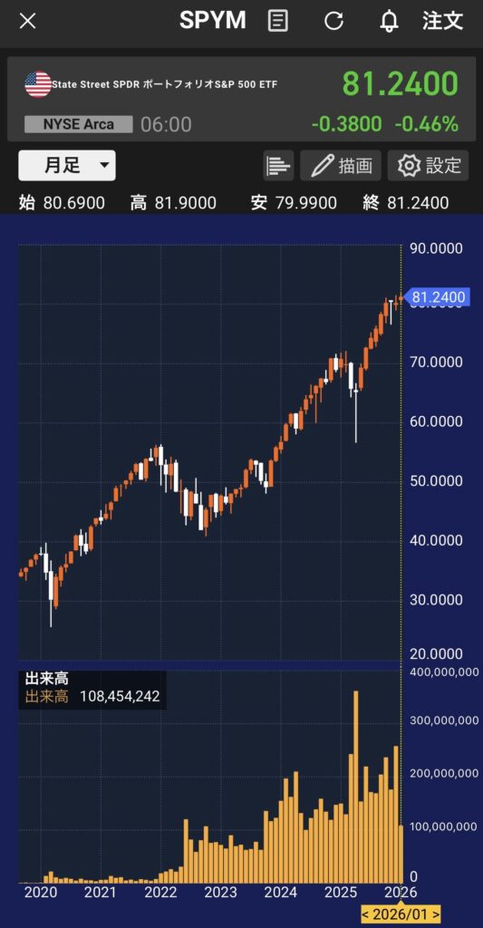 - SPYM: 1株 約80ドル(約1.2万円) で買える。