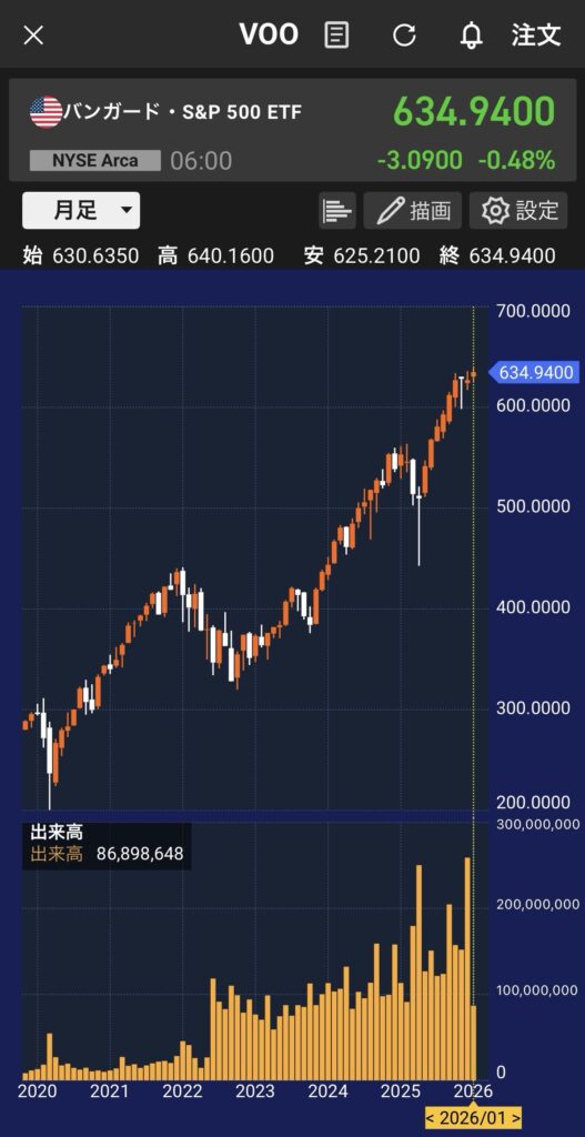 - VOO: 1株買うのに約635ドル(約10万円)必要。